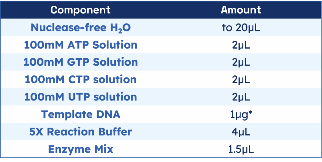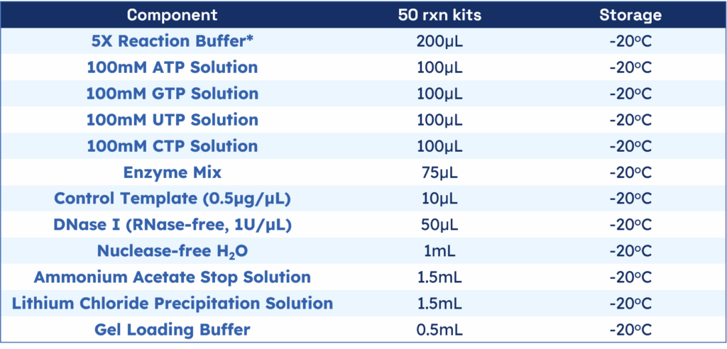 Quality Assurance: All components are tested in a functional assay as described in this procedure. A 20μL reaction containing 1 μg of the control template DNA which codes for a ~800b transcript synthesized >150μg of RNA after a 2 hr incubation.