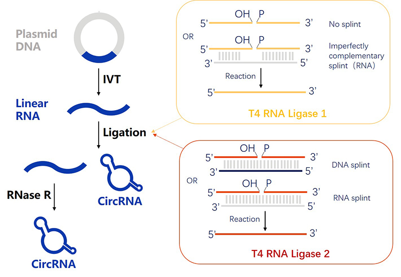 RNA cyclisation: circular RNA is produced by joining the two ends within the RNA molecule by T4 RNA ligase 1 (T4 Rnl1) or T4 RNA ligase 2 (T4 Rnl2) catalysing the joining of 5′-phosphate and 3′-hydroxyl groups at the RNA terminus;