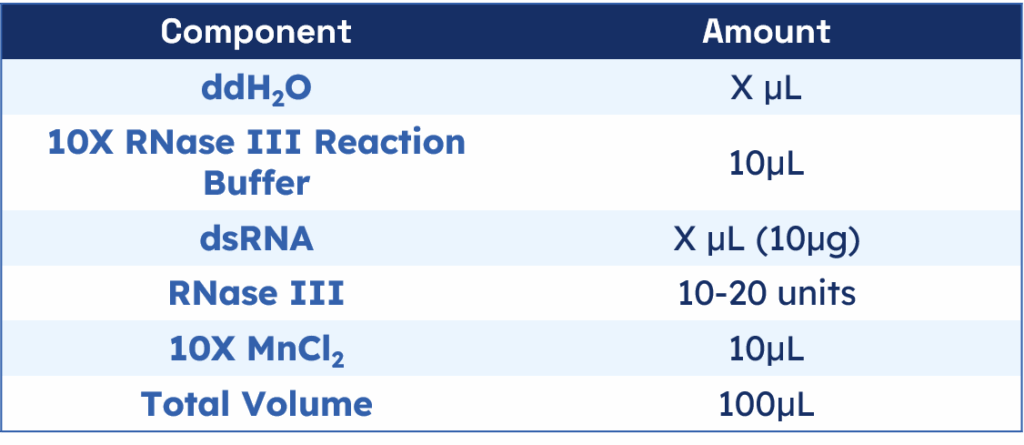 Unit Definition: One unit is the amount of enzyme required to digest 1μg of dsRNA to siRNA in 20 minutes at 37℃ in a total reaction volume of 50μL.